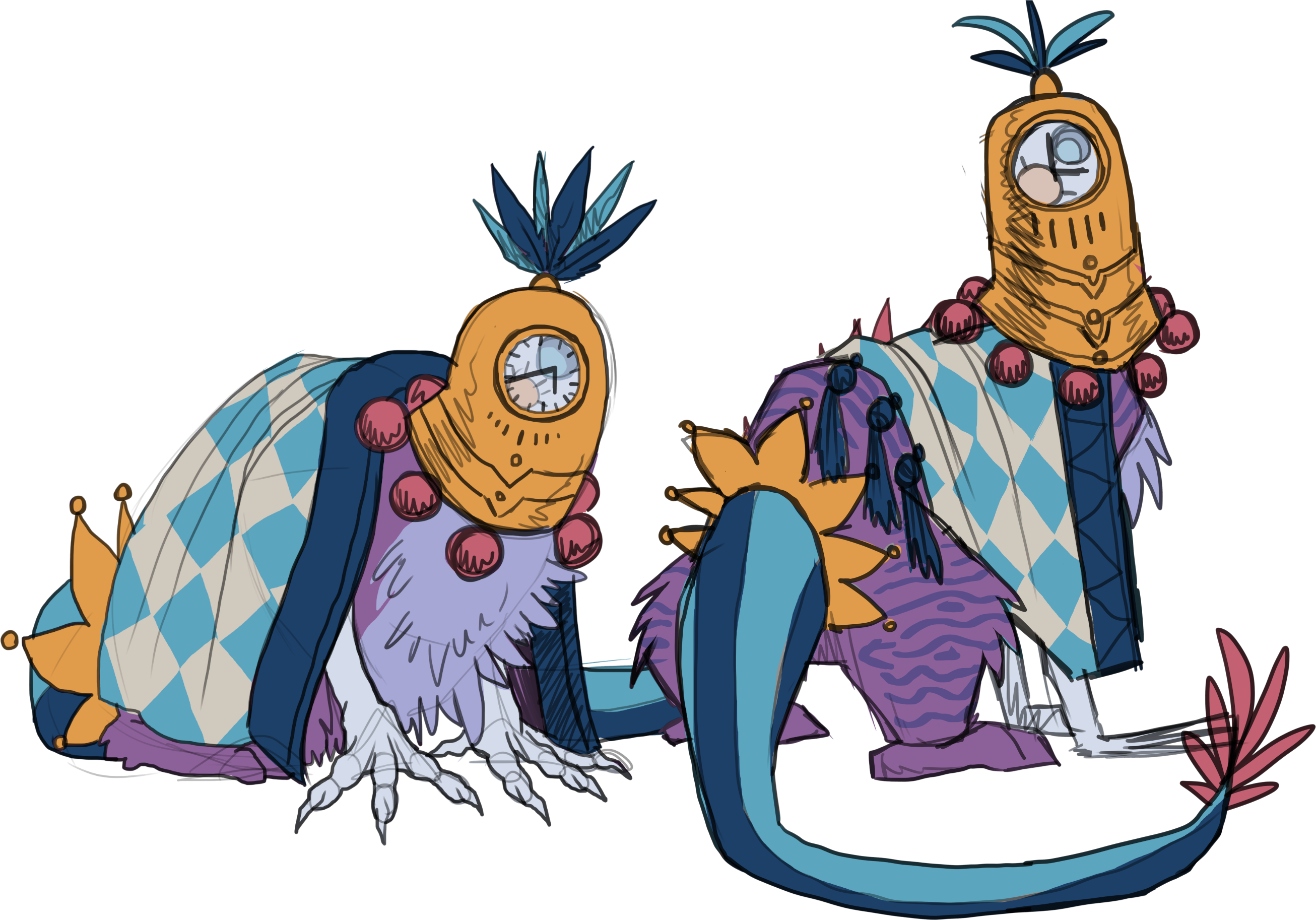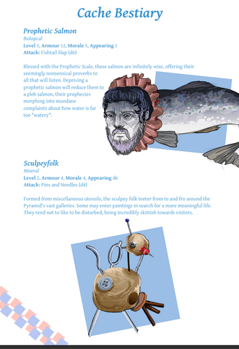 -Four inhabitants of the Cache: the ever-wise Prophetic Salmon, the hoarding Sculpteyfolk, lost Looters and the guarding Chimeera.